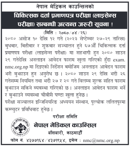 Nepal Medical Council has published a notice for the licensing Exam 2080 on 26th Shrawan.